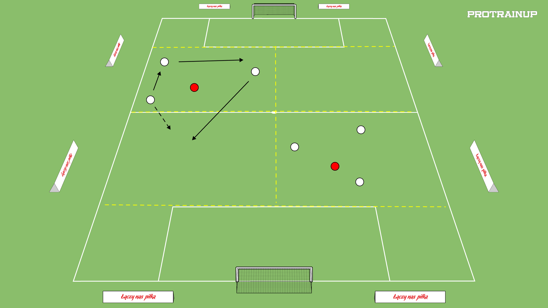 Pole podzielone na 4 mniejsze kwadraty. Zawodnicy grają grę 3x1, po wykonaniu określonej liczby podań przez trenera, ich zadaniem jest zmiana ciężaru gry do innego kwadratu, po podaniu do wychodzącego zawodnika. Zawodnicy za każde przegranie dostają 1 pkt. W momencie odbioru piłki przez obrońców punkty są kasowane. Obrońcy w momencie odbioru muszą wyprowadzić piłkę za pole.