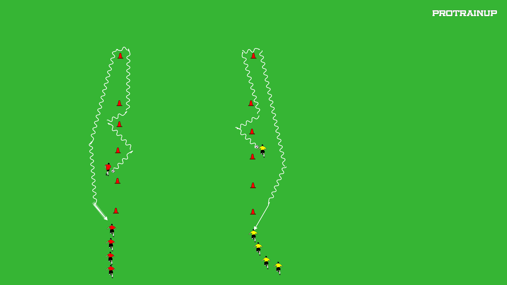 Zawodnicy podzieleni na dwa zespoły. Zadaniem zawodników jest jak najszybsze przeprowadzenie piłki pomiędzy pachołkami, a następnie powrót do swojego rzędu wtedy rusza kolejny zawodnik. Trener może zmienić sposób prowadzenia piłki.