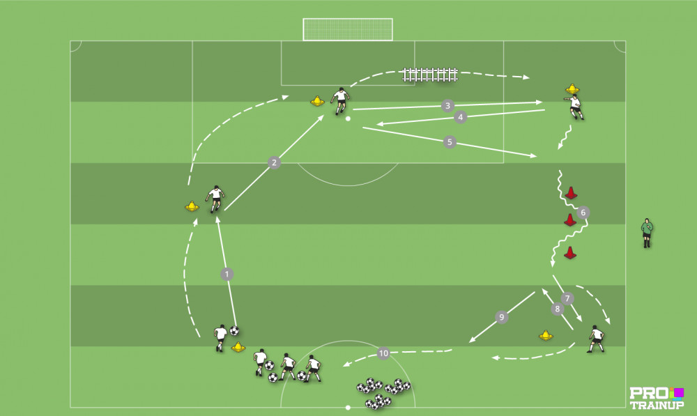 1. Przyjęcie + Podanie + Koordynacja na drabince koordynacyjnej + prowadzenie piłki po slalomie