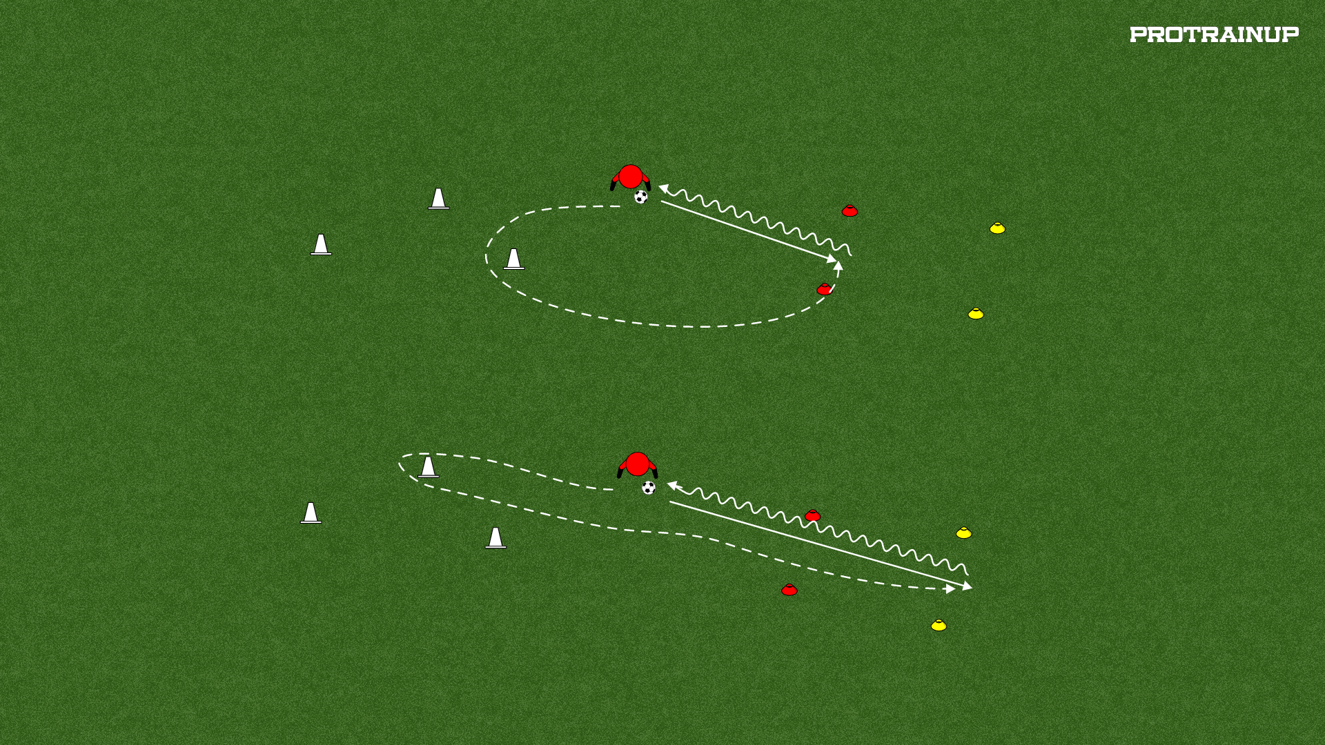 Uwagi: za każdym razem trener zmienia trasę i bramkę do podania(np. podanie na talerzyki czerwone i obiegnięcie 1 pachołka., podanie na żółte i obiegnięcie 2 itd.)