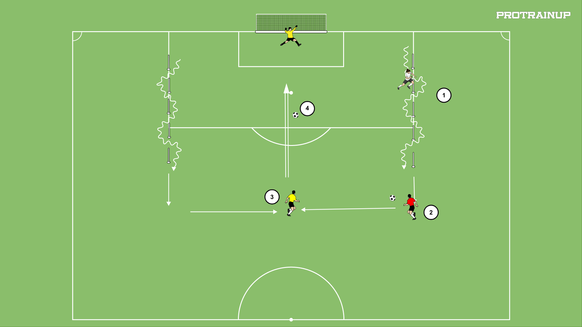 Zawodnik nr 3 przyjmuje piłkę kierunkowo i oddaje strzał na bramke.