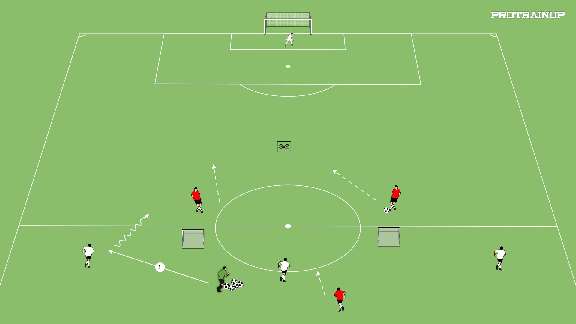 Ustawienie jak na rysunku. bramkarz, dwóch obrońców (4/5), 3 atakujących (7/11/9). Rozpoczynają obrońcy podaniami między sobą, w pewnym momencie trener decyduje się na podanie do jednego z atakujących i rozpoczyna się gra 3x2 gdzie celem gry przez atakujących jest zdobycie bramki, celem obrońców jest opóźnianie gry i przerywanie, jeśli uda się przejąć to zagrywają do małych bramek. W momencie włączenia piłki przez trenera, do gry włącza się kolejny zawodnik który jest powracającym obrońcą.