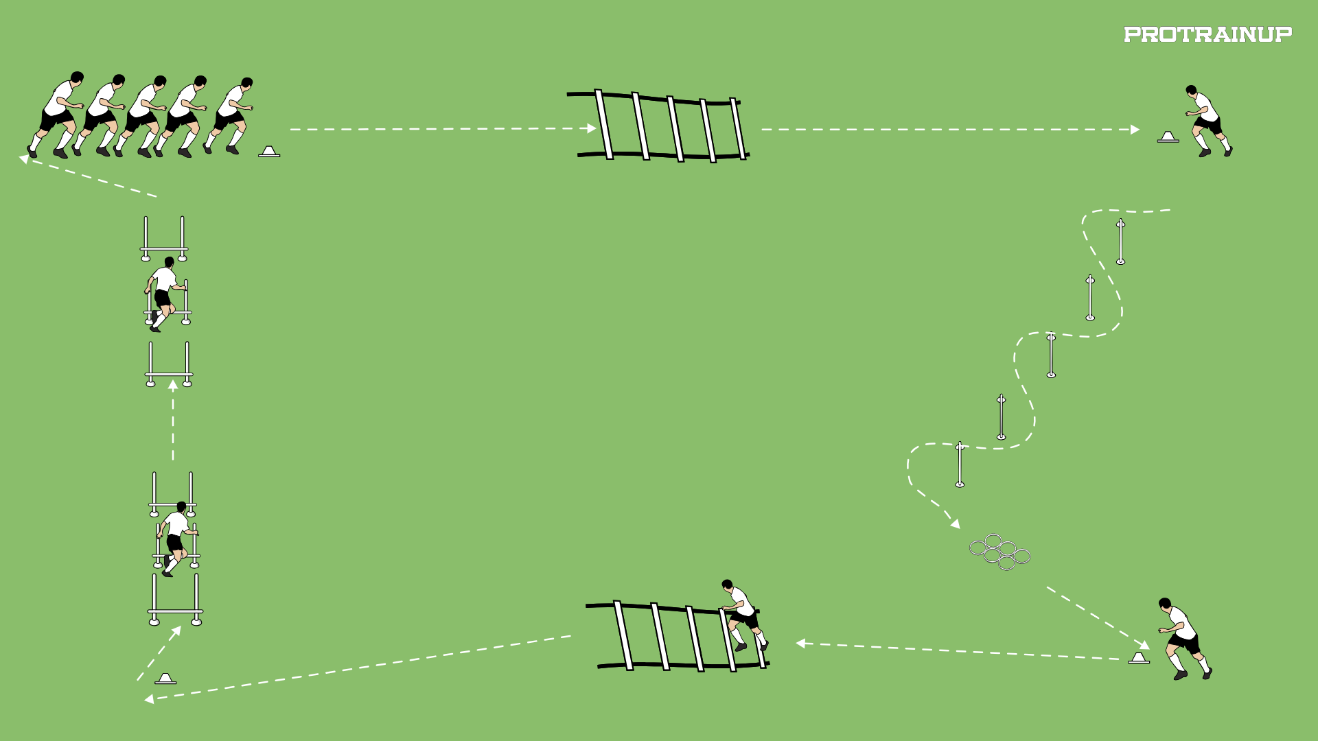 Zawodnicy ustawiają się jeden za drugim na torze sprawnościowym, po kolei pokonując jego etapy. Każdy zawodnik ma za zadanie pokonać drabinkę koordynacyjną, następnie slalom pomiędzy tyczkami, bieg po okręgach, znowu drabinka koordynacyjna, a w końcowej fazie przeskoczyć bokiem, raz w lewą, raz w prawą stronę ponad poprzeczkami.
